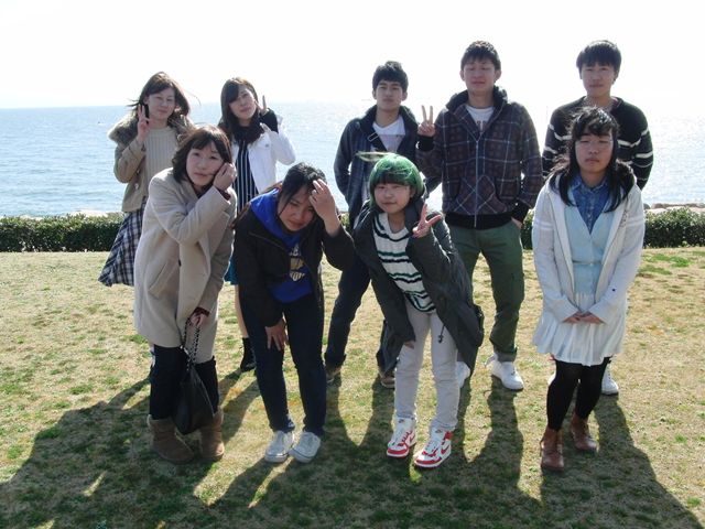 まだ、肌寒い海岸ですがみんなで記念撮影です。